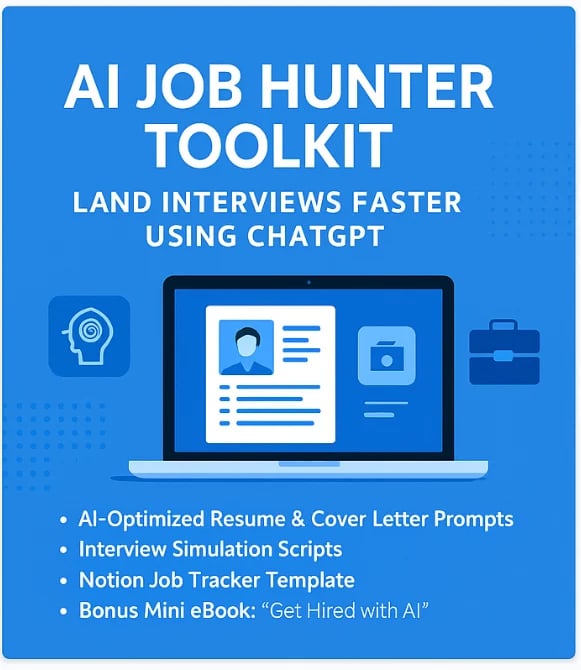Our flagship product — the AI Job Hunter Toolkit — gives you ready-to-use ChatGPT prompts, resume templates, cover letter builders, and interview prep guides designed to help you stand out in today’s competitive job market.